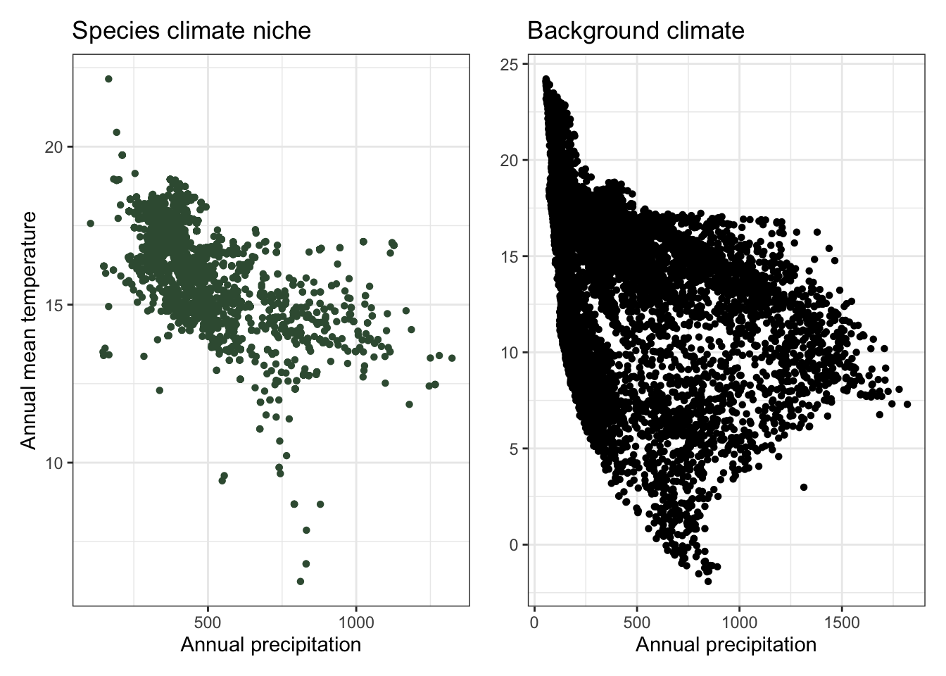 - Plot species climate niche and background climate (temperature vs. precipitation)