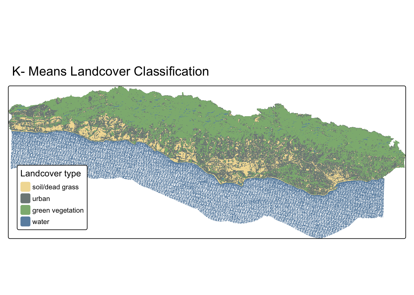 Now we’re ready to run the k-means algorithm! We specify centers = 4 because we want to find 4 groups (matching our 4 landcover types). The nstart = 25 parameter tells the algorithm to try 25 different random starting positions and pick the best result - this helps avoid getting stuck in a poor solution. K-means works by iteratively grouping pixels with similar spectral signatures together until it finds stable clusters.